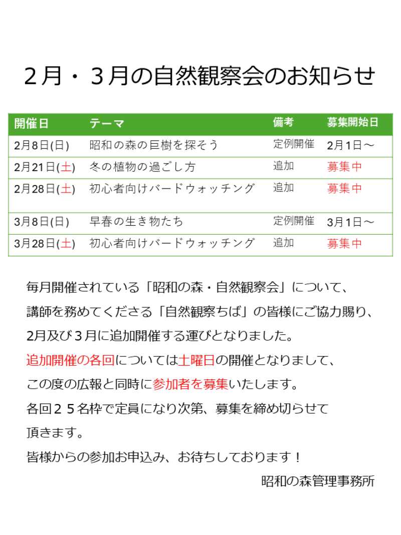 2ー3月に、「自然観察会」を追加開催することとなりました!