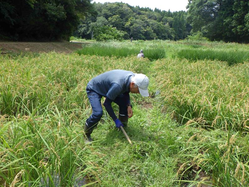 畦道の草刈りと補強整備を行い、その後皆さんで稲刈りの準備をしました。