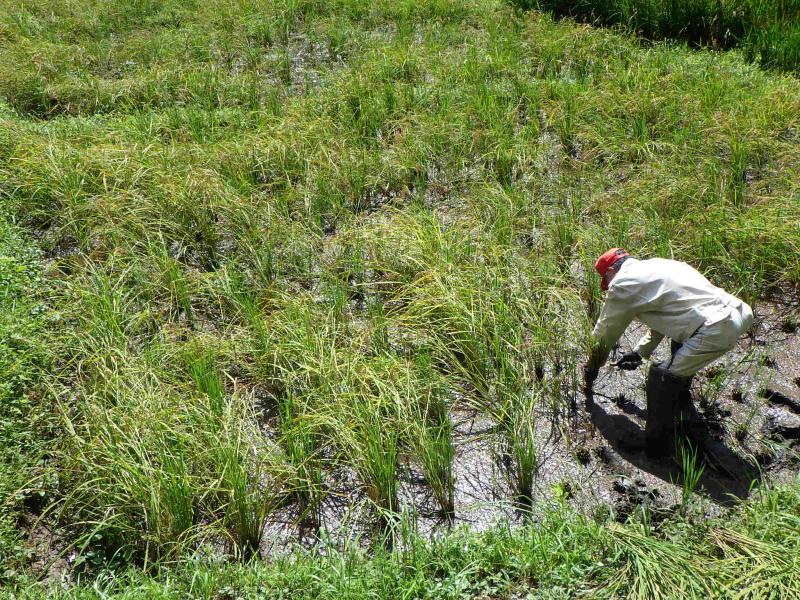 曇り空でムシムシした中、皆さんで稲刈りを行い、おだに稲を掛けました。