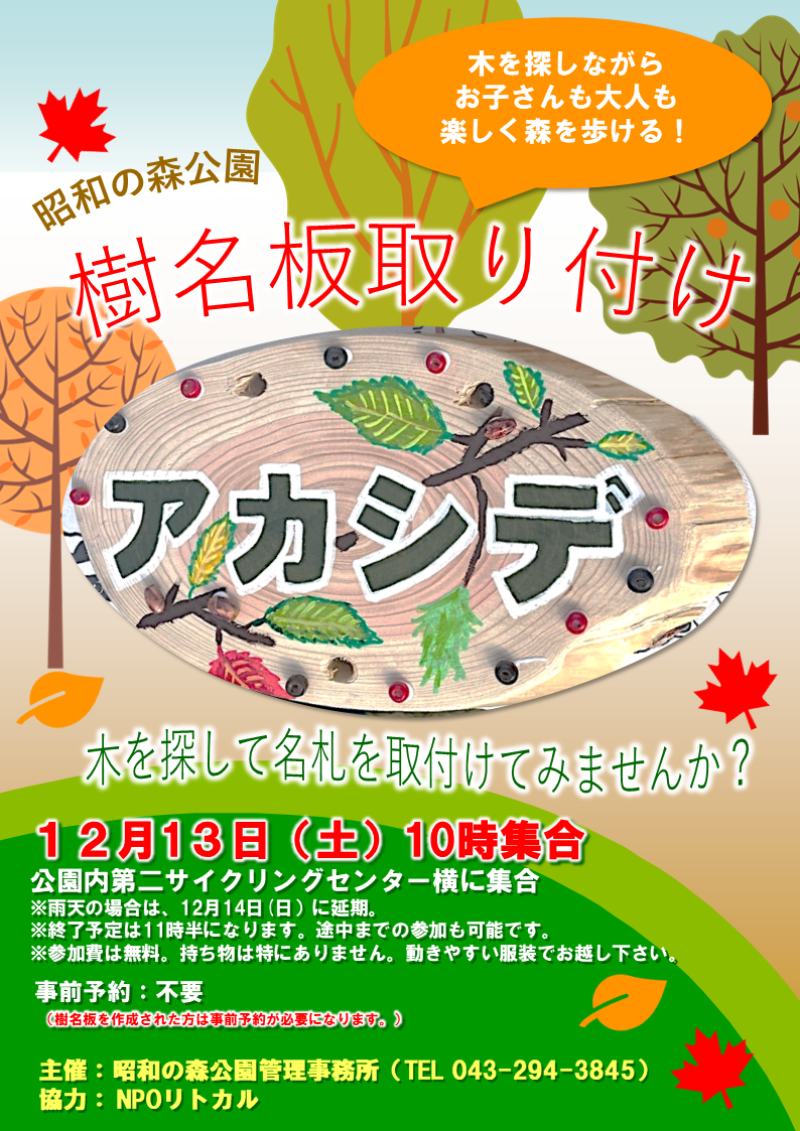 昭和の森にある「木」に、説明が見れるQRコードを貼った案内板(樹名板)の取り付け作業を行います。