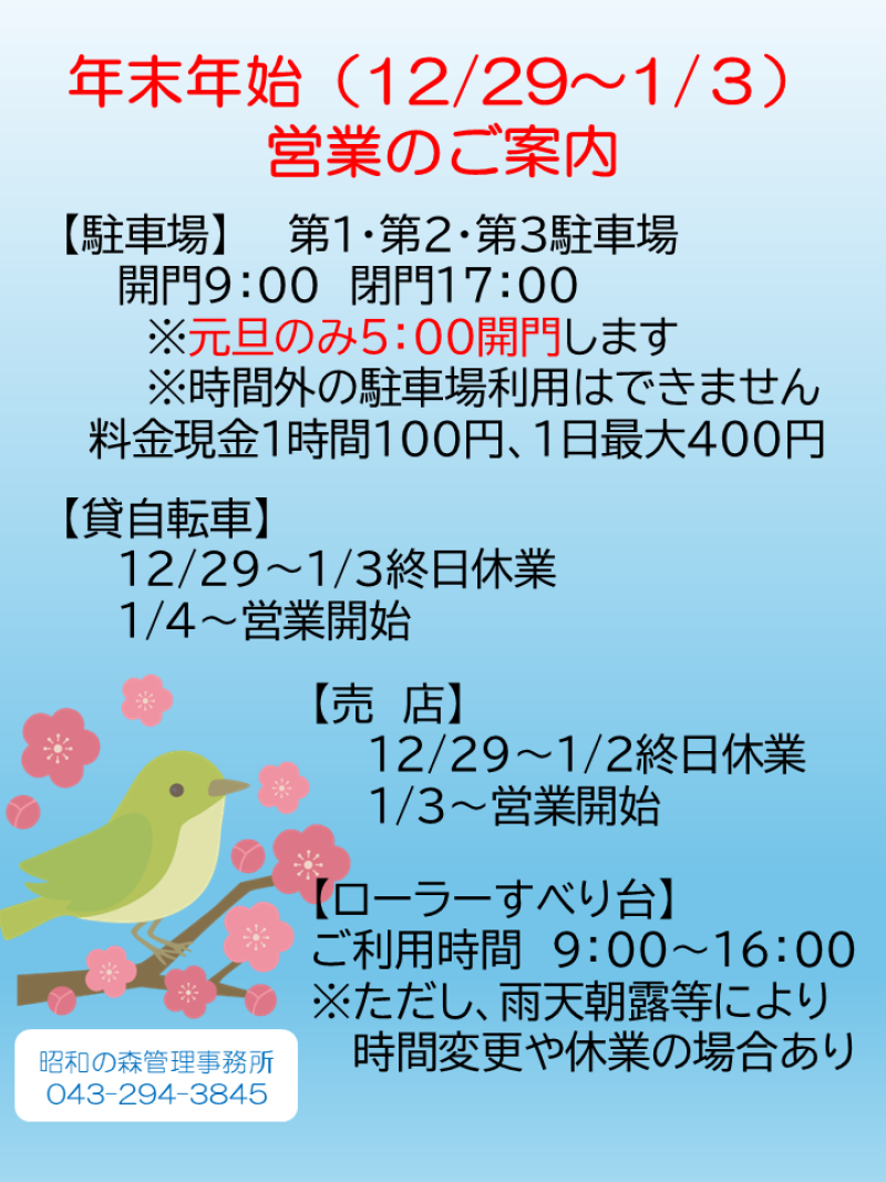 12月29日(月)~1月4日(木)の年末年始期間は、施設の休業等と異なる営業となります。
