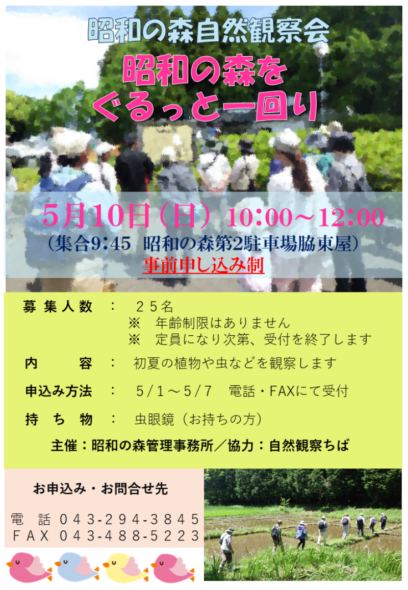 9:45 昭和の森第2駐車場脇東屋へ集合し、正午ごろ解散(予定)