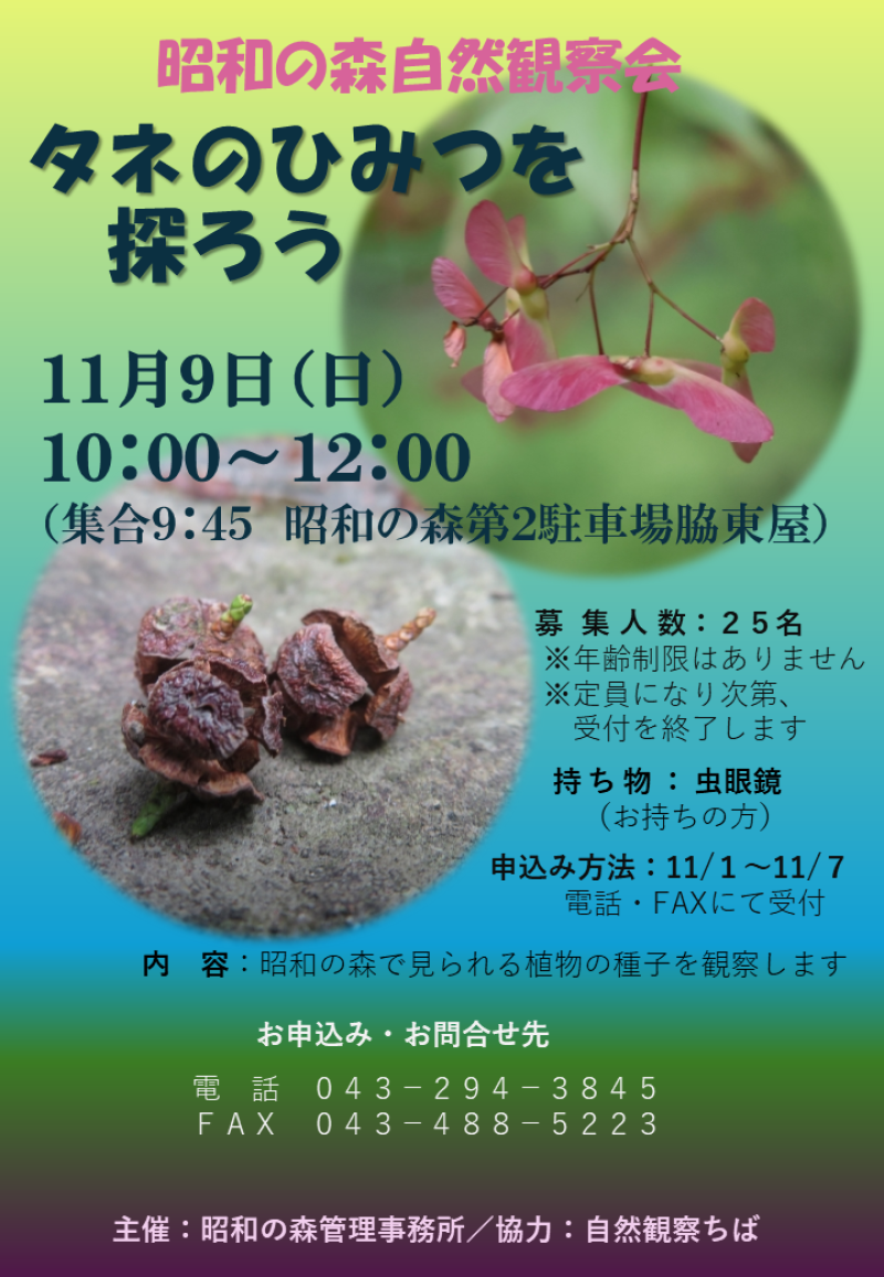 9:45 昭和の森第2駐車場脇東屋へ集合し、正午ごろ解散(予定)